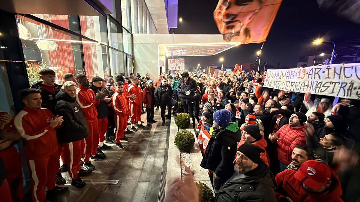 Zeci de suporteri din Sibiu s-au adunat joi seara în fața Hotelului Ramada pentru a-și arăta susținerea față de echipa Dinamo, înaintea partidei programate vineri cu AFC Hermannstadt. Acesta a fost un gest de încurajare pentru favoriți, care aspiră la obținerea celui de-al 19-lea titlu de campioană, potrivit celor prezenți la eveniment.